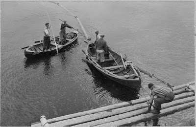 | "Pollarit ja puomit" ja tukkilautta, sekä tukkilaiset liikkeellä "kelupaatilla". Sastamalan seudun museon kuvakokoelma. |